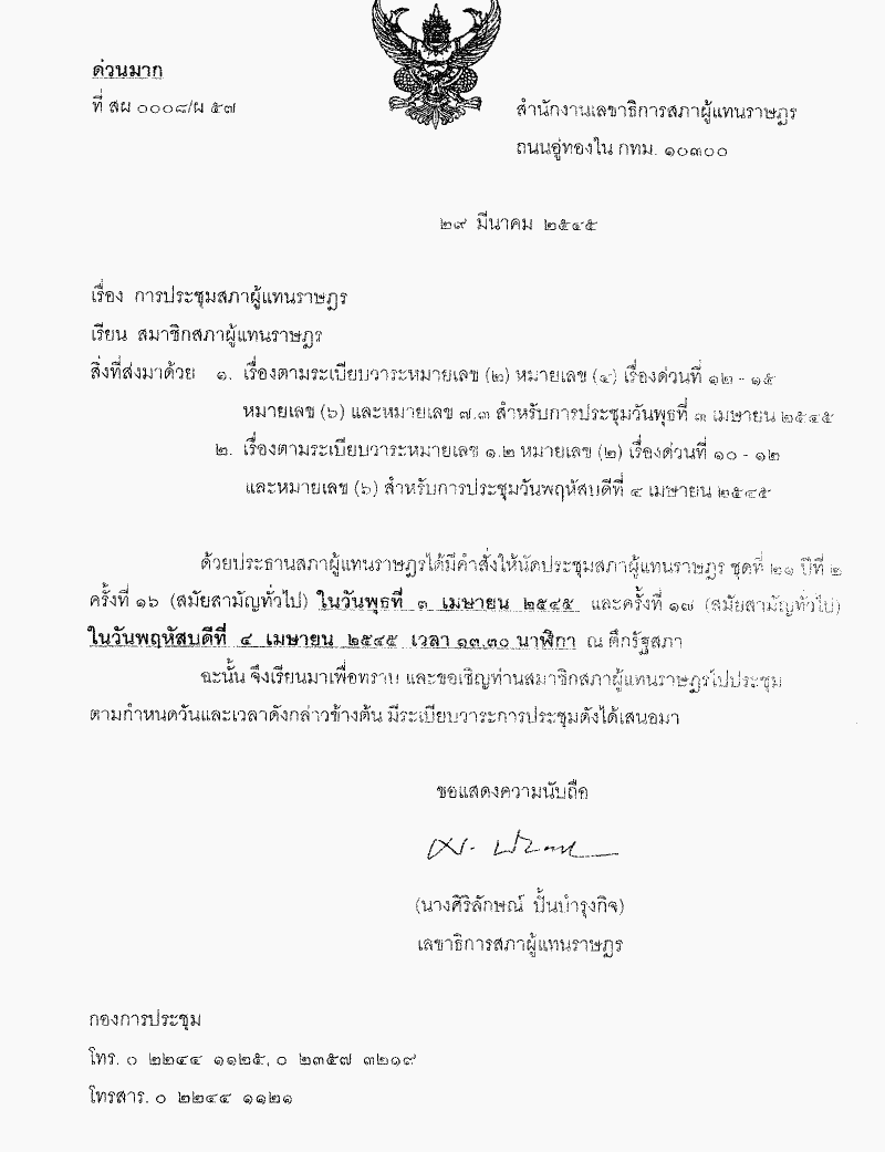 • ระเบียบวาระการประชุมสภาผู้แทนราษฎร ชุดที่ 21 ปีที่ 2 ครั้งที่ 16 (สมัยสามัญทั่วไป) วันพุธที่ 3 เมษายน 2545