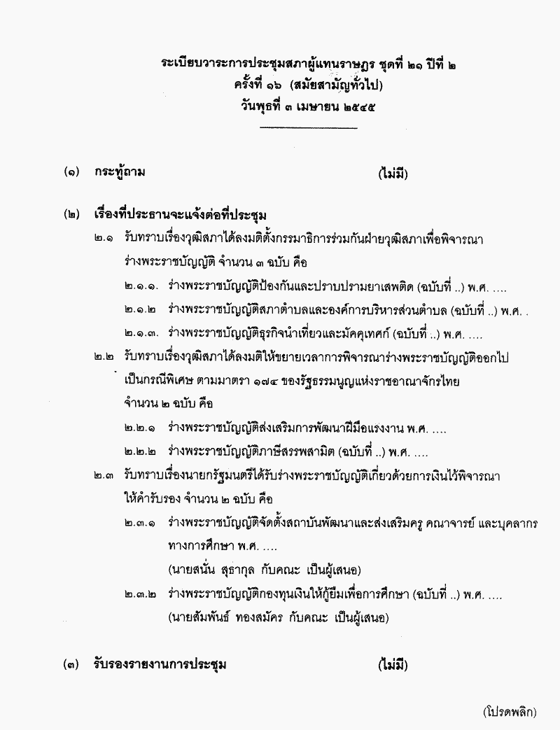 • ระเบียบวาระการประชุมสภาผู้แทนราษฎร ชุดที่ 21 ปีที่ 2 ครั้งที่ 16 (สมัยสามัญทั่วไป) วันพุธที่ 3 เมษายน 2545
