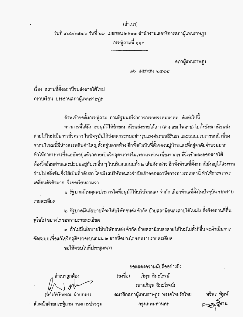 กระทู้ถามที่ 110 เรื่อง สถานที่ตั้งสถานีขนส่งสายใต้ใหม่ นายภิมุข สิมะโรจน์ เป็นผู้ตั้งกระทู้ถาม ถามรัฐมนตรีว่าการกระทรวงคมนาคม |