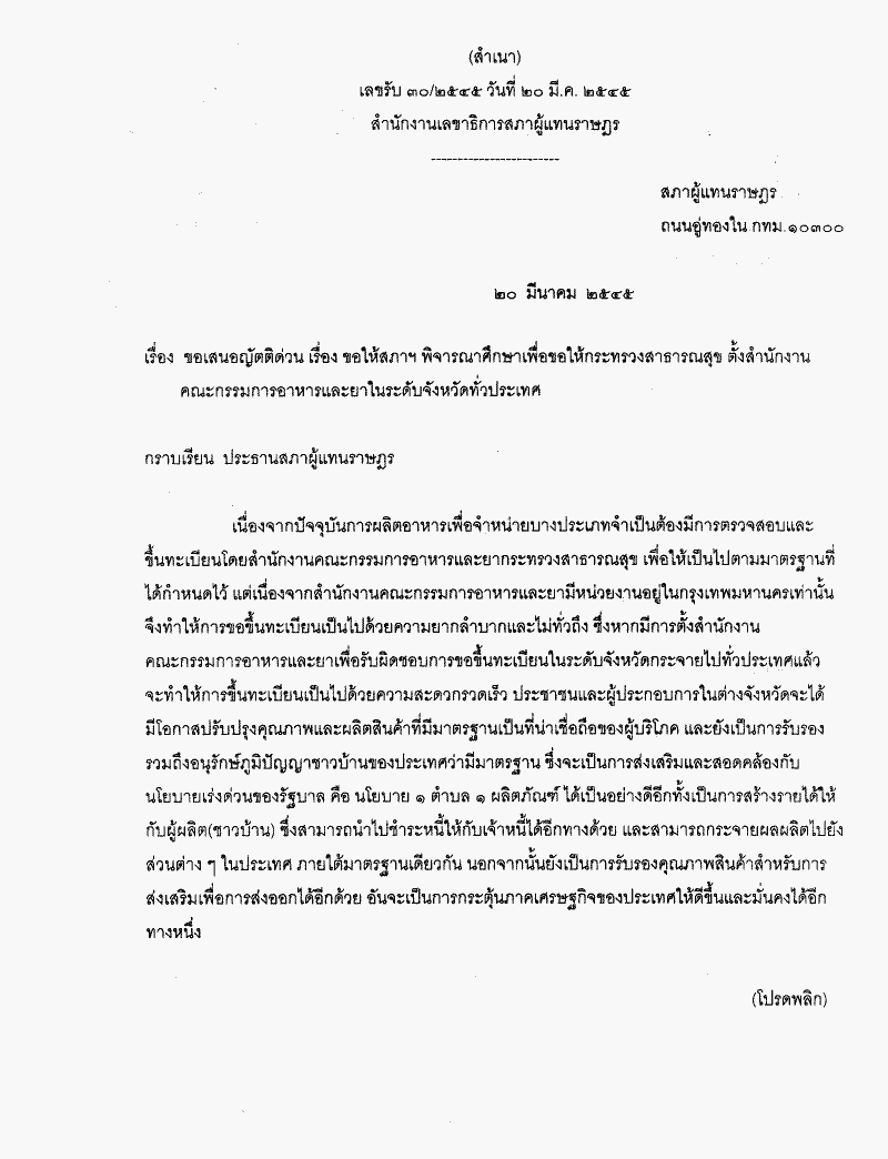 • ขอเสนอญัตติด่วน เรื่อง ขอให้สภาฯ พิจารณาศึกษาเพื่อขอให้กระทรวงสาธารณสุข ตั้งสำนักงานคณะกรรมการอาหารและยาในระดับจังหวัดทั่วประเทศ