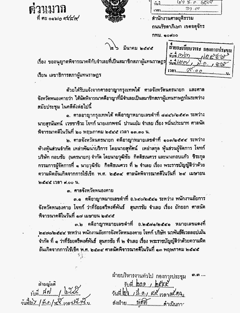 • ขออนุมัติพิจารณาคดีกับจำเลยที่เป็นสมาชิกสภาผู้แทนราษฏร