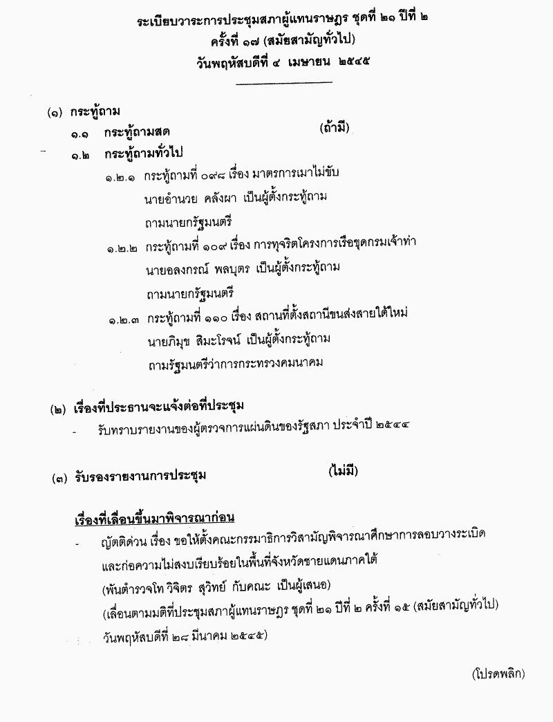 • ระเบียบวาระการประชุมสภาผู้แทนราษฎร ชุดที่ 21 ปีที่ 2 ครั้งที่ 17 (สมัยสามัญทั่วไป) วันพฤหัสบดีที่ 4 เมษายน 2545