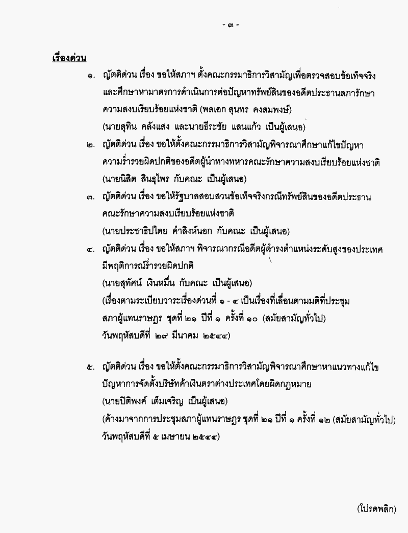 • ระเบียบวาระการประชุมสภาผู้แทนราษฎร ชุดที่ 21 ปีที่ 2 ครั้งที่ 17 (สมัยสามัญทั่วไป) วันพฤหัสบดีที่ 4 เมษายน 2545