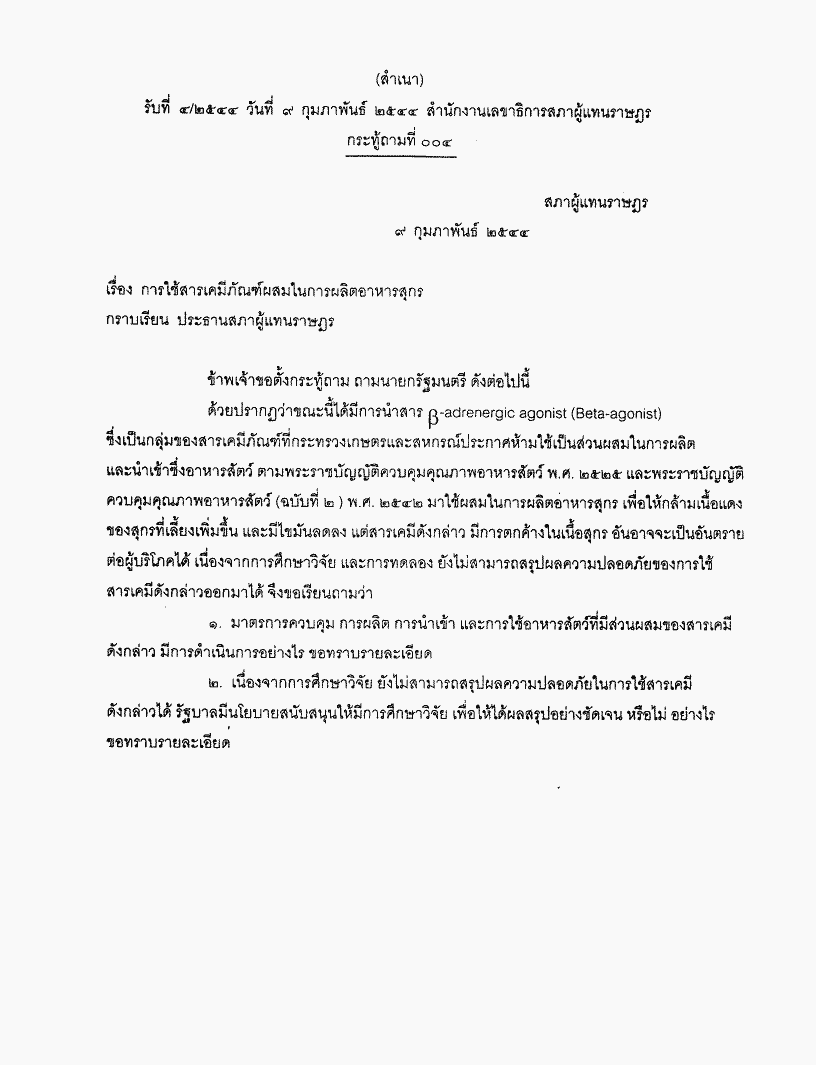 ๑.๒.๑ กระทู้ถาม เรื่อง การใช้สารเคมีภัณฑ์ผสมในการผลิตอาหารสุกร นายเสกสรรค์ แสนภูมิ เป็นผู้ตั้งกระทู้ถาม ถามนายกรัฐมนตรี |