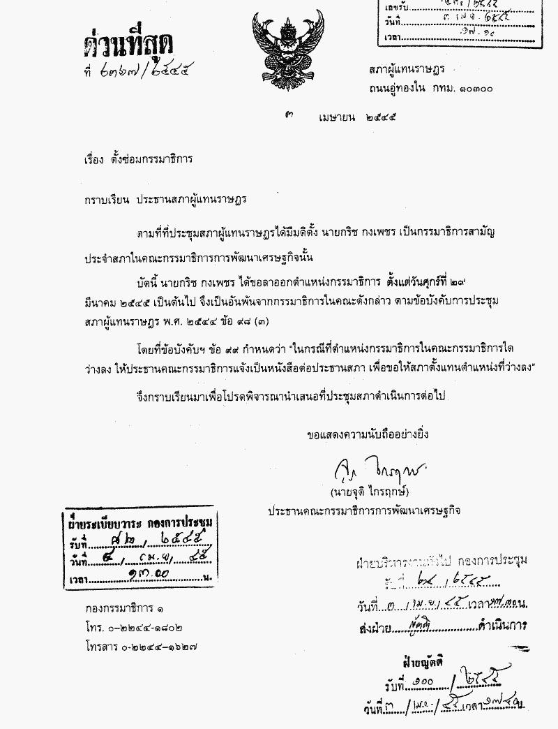 ชื่อเอกสาร : ตั้งซ่อมกรรมาธิการสามัญประจำสภา ในคณะกรรมาธิการการพัฒนาเศรษฐกิจแทนตำแหน่งที่ว่างลง 1 ตำแหน่ง เพราะลาออก (นายกริช กงเพชร)
