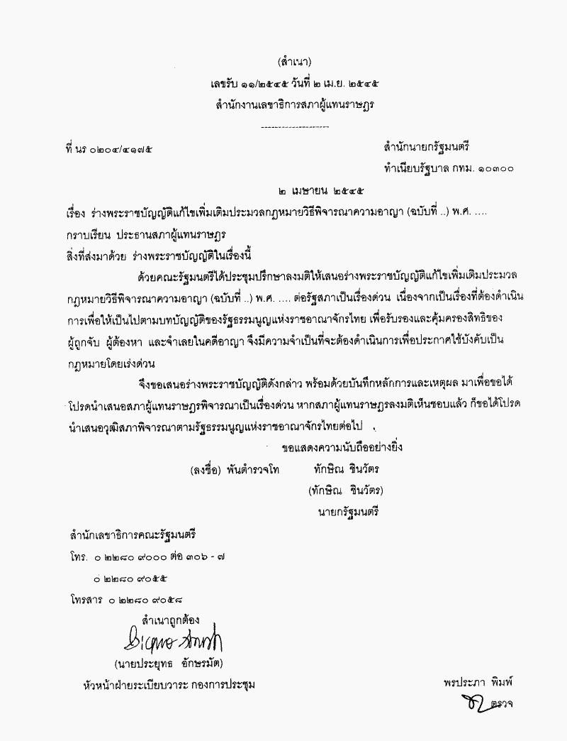 ร่างพระราชบัญญัติแก้ไขเพิ่มเติมประมวลกฎหมายวิธีพิจารณาความอาญา (ฉบับที่..) พ. ศ..... (คณะรัฐมนตรี เป็นผู้เสนอ)