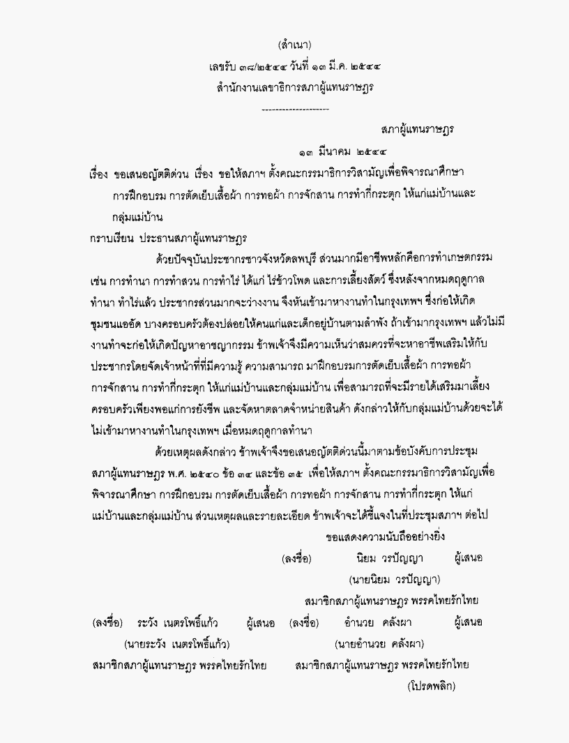 ขอเสนอญัตติด่วน เรื่อง ขอให้สภาฯ ตั้งคณะกรรมาธิการวิสามัญเพื่อพิจารณาศึกษาการฝึกอบรมการตัดเย็บเสื้อผ้า การทอผ้า การจักสาน การทำกี่กระตุก ให้แก่แม่บ้านและกลุ่มแม่บ้าน |