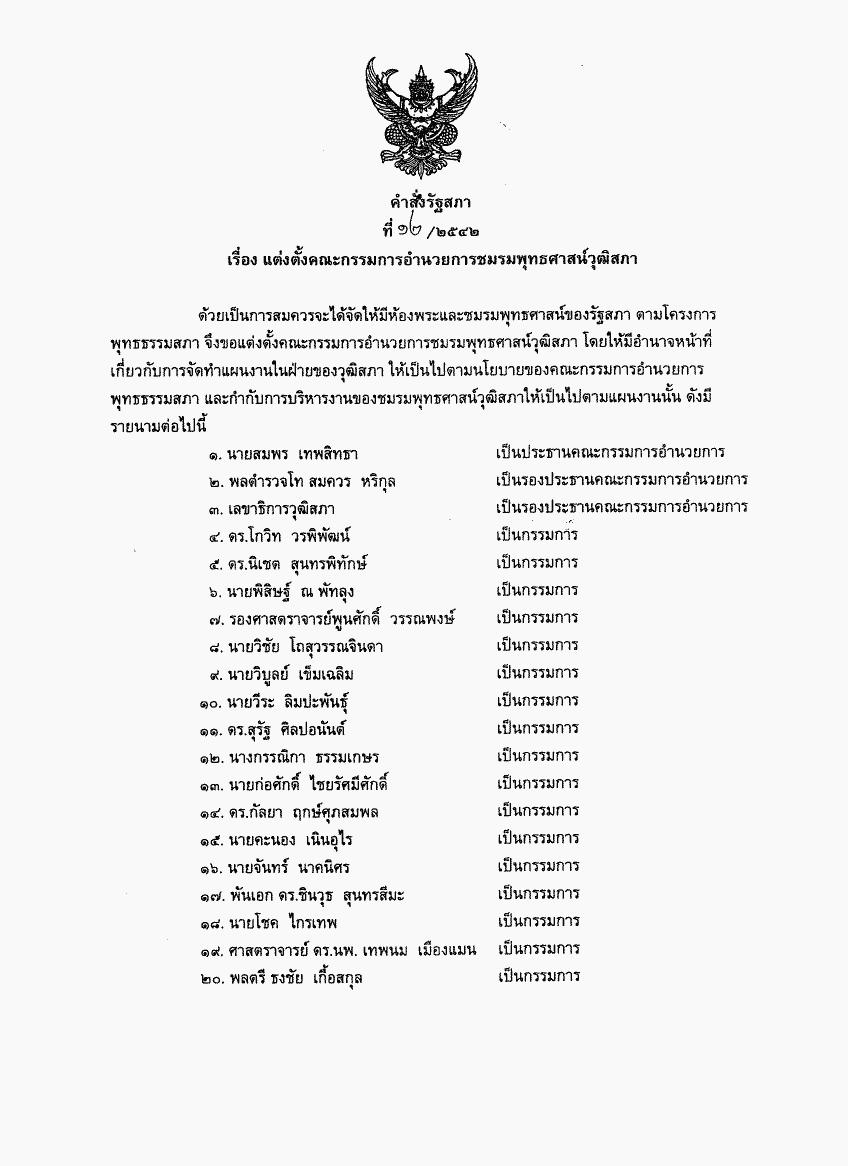 คำสั่งรัฐสภาที่ 12 / 2542 เรื่อง แต่งตั้งคณะกรรมการอำนวยการชมรมพุทธศาสน์วุฒิสภา |