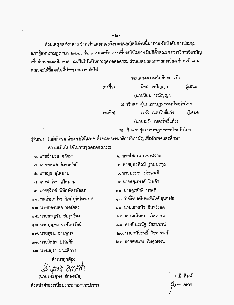 ขอเสนอญัตติด่วน เรื่อง ขอให้สภาฯ ตั้งคณะกรรมาธิการวิสามัญ เพื่อสำรวจและศึกษาความเป็นไปได้ในการขุดคอคอดกระ (นายนิยม วรปัญญา และนายระวัง เนตรโพธิ์แก้ว เป็นผู้เสนอ) |