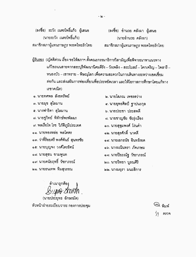 ขอเสนอญัตติด่วน เรื่อง ขอให้สภาฯ ตั้งคณะกรรมาธิการวิสามัญเพื่อพิจารณาหาแนวทางแก้ไขถนนสายจากสระบุรีพัฒนานิคมดีรัง - วังเพลิง - สระโบสถ์ -โคกเจริญ ไพสารี - หนองบัว - เขาทราย - พิษณุโลก เพื่อความละดวกในการเดินทางระหว่างเขตเชื่อมต่อกันและส่งเสริมการท่องเที่ยวเพื่อประหยัดเวลา และให้โอกาสการศึกษาโดยแก้ทางเรขาคณิต |