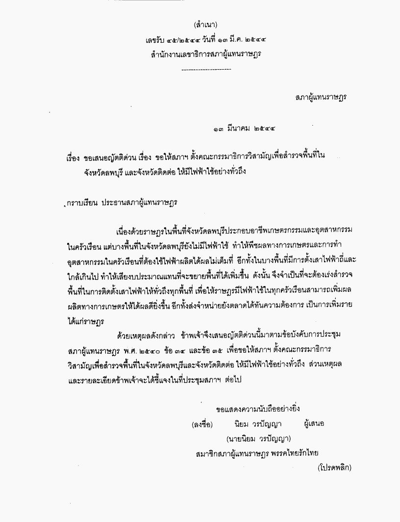 ขอเสนอญัตติด่วน เรื่อง ขอให้สภาฯ ตั้งคณะกรรมาธิการวิสามัญเพื่อสำรวจพื้นที่ในจังหวัดลพบุรี และจังหวัดติดต่อให้มีไฟฟ้าใช้อย่างทั่วถึง |