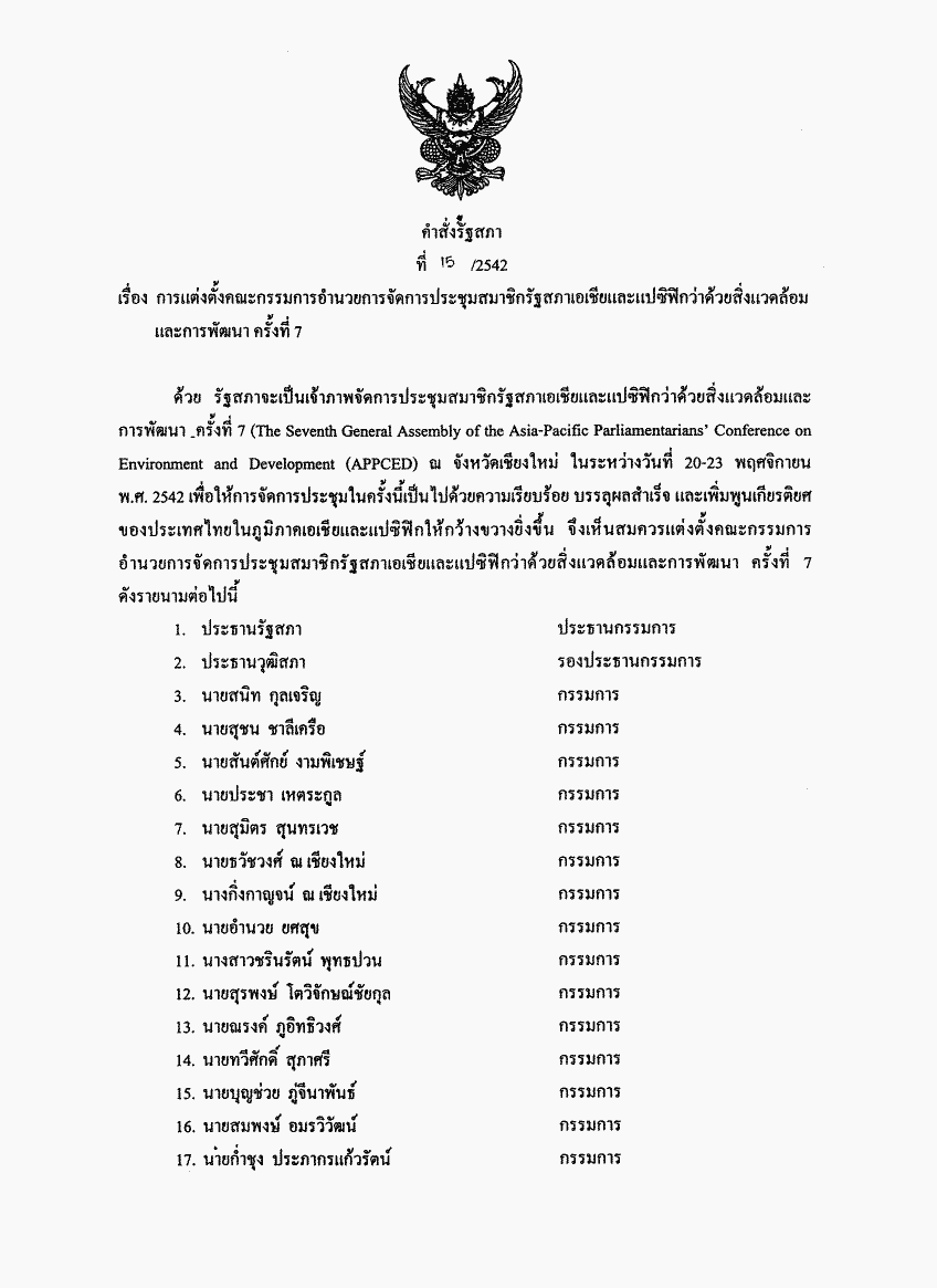 คำสั่งรัฐสภา ที่ 15/2542 เรื่อง การแต่งตั้งคณะกรรมการอำนวยการจัดการประชุมสมาชิกรัฐสภาเอเซียและเปซิฟิกว่าด้วยสิ่งแวดล้อมและการพัฒนา ครั้งที่ 7 |