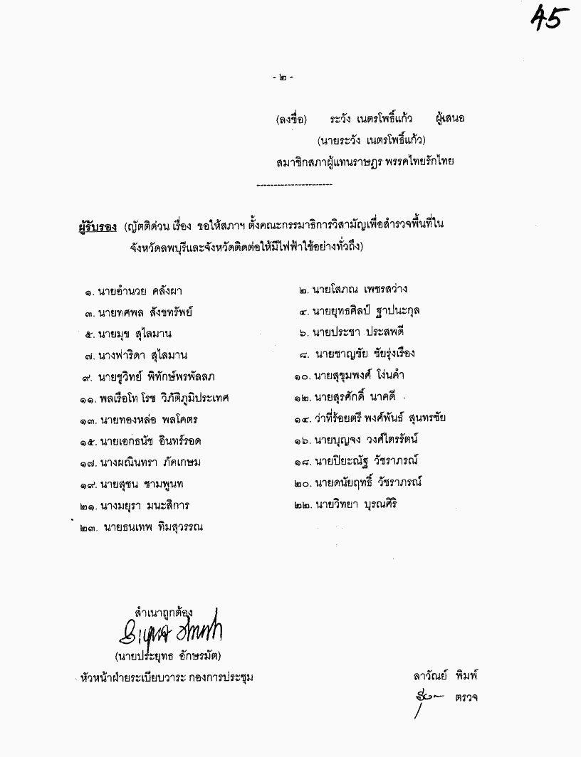 ขอเสนอญัตติด่วน เรื่อง ขอให้สภาฯ ตั้งคณะกรรมาธิการวิสามัญเพื่อสำรวจพื้นที่ในจังหวัดลพบุรี และจังหวัดติดต่อให้มีไฟฟ้าใช้อย่างทั่วถึง |