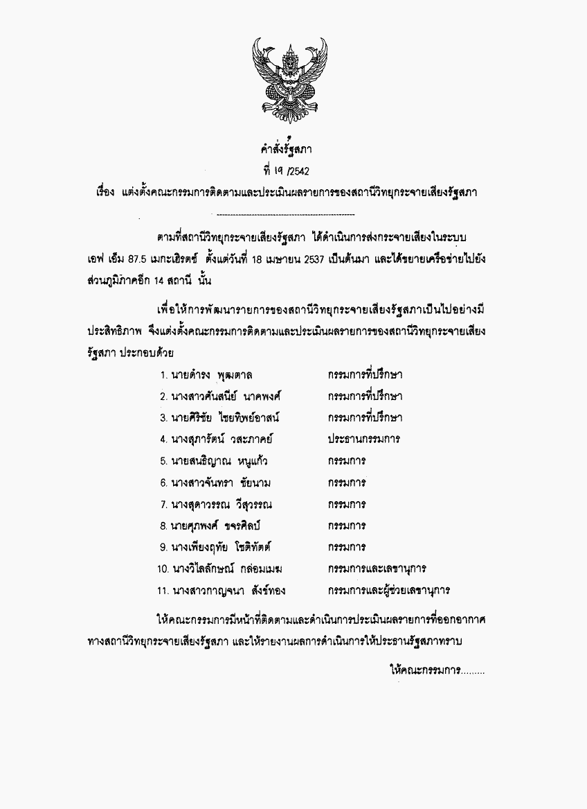 คำสั่งรัฐสภา ที่ 19/2542 เรื่อง แต่งตั้งคณะกรรมการติดตามและประเมินผลรายการของสถานีวิทยุกระจายเสียงรัฐสภา |