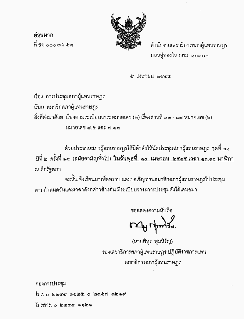 ระเบียบวาระการประชุมสภาผู้แทนราษฎร ชุดที่ 21 ปีที่ 2 ครั้งที่ 18 (สมัยสามัญทั่วไป) วันพุธที่ 10 เมษายน 2545 |