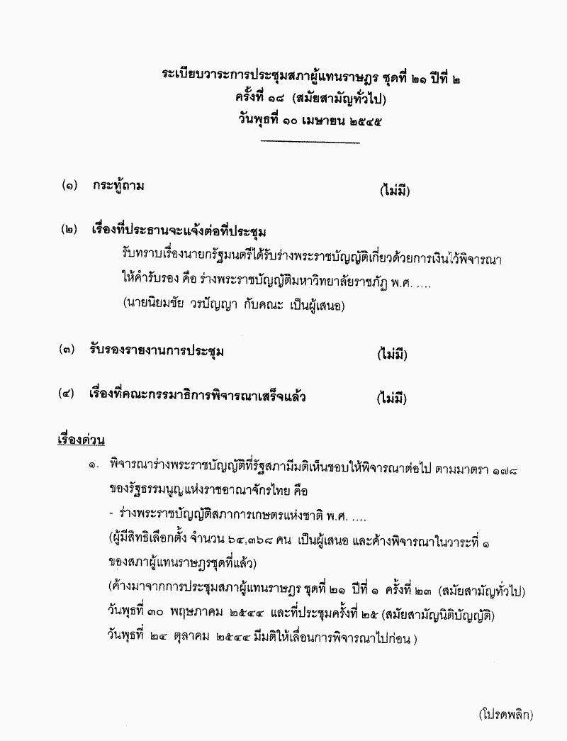 • ระเบียบวาระการประชุมสภาผู้แทนราษฎร ชุดที่ 21 ปีที่ 2 ครั้งที่ 18 (สมัยสามัญทั่วไป) วันพุธที่ 10 เมษายน 2545