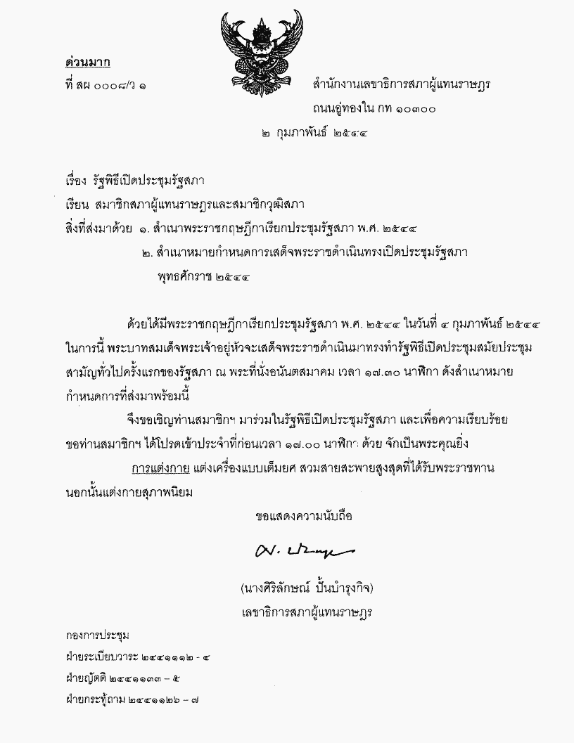 • พระราชกฤษฎีกา เรียกประชุมรัฐสภา พ.ศ. ๒๕๔๔