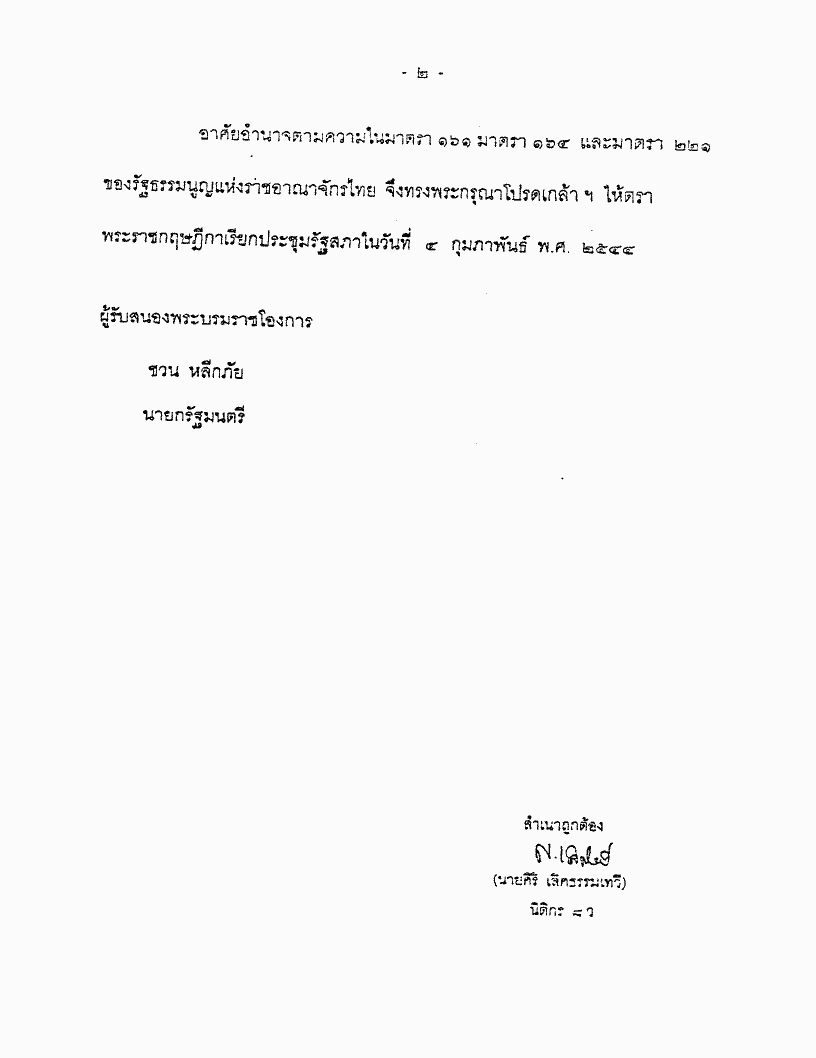 ชื่อเอกสาร :   พระราชกฤษฎีกา เรียกประชุมรัฐสภา พ.ศ. ๒๕๔๔
