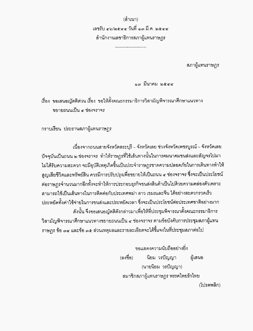 ๖.๖ ญัตติ เรื่อง ขอให้ตั้งคณะกรรมาธิการวิสามัญพิจารณาศึกษาแนวทางขยายถนนเป็น ๔ ช่องจราจร (นายนิยม วรปัญญา กับคณะ เป็นผู้เสนอ) |