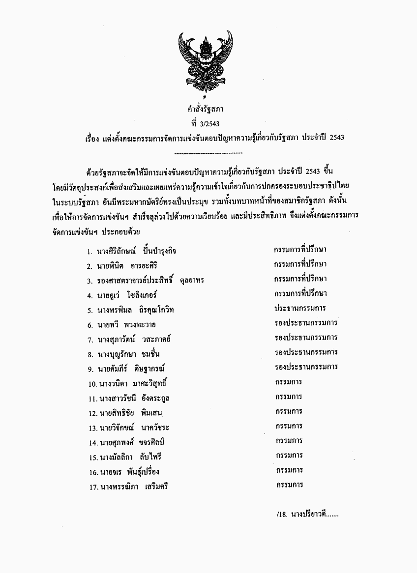แต่งตั้งคณะกรรมการจัดการแข่งขันตอบปัญหาความรู้เกี่ยวกับรัฐสภา ประจำปี 2543 |