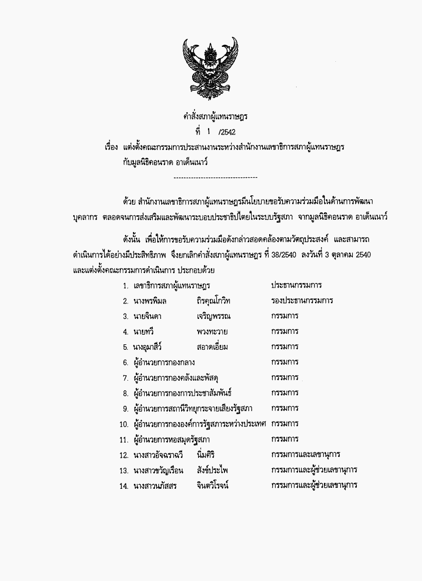 คำสั่งสภาผู้แทนราษฎร ที่ 1/2542 เรื่อง แต่งตั้งคณะกรรมการประสานงานระหว่างสำนักงานเลขาธิการสภาผู้แทนราษฎรกับมูลนิธิคอนราด อาเด็นเนาว์ |