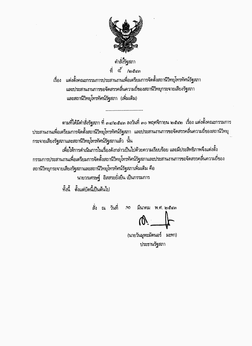 แต่งตั้งคณะกรรมกานประสานงานเพื่อเตรียมการจัดตั้งสถานีวิทยุโทรทัศน์รัฐสภาและประสานงานการขอจัดสรรคลื่นความถี่ของสถานีวิทยุกระจายเสียงรัฐสภาและสถานีวิทยุโทรทัศน์รัฐสภา (เพิ่มเติม) |