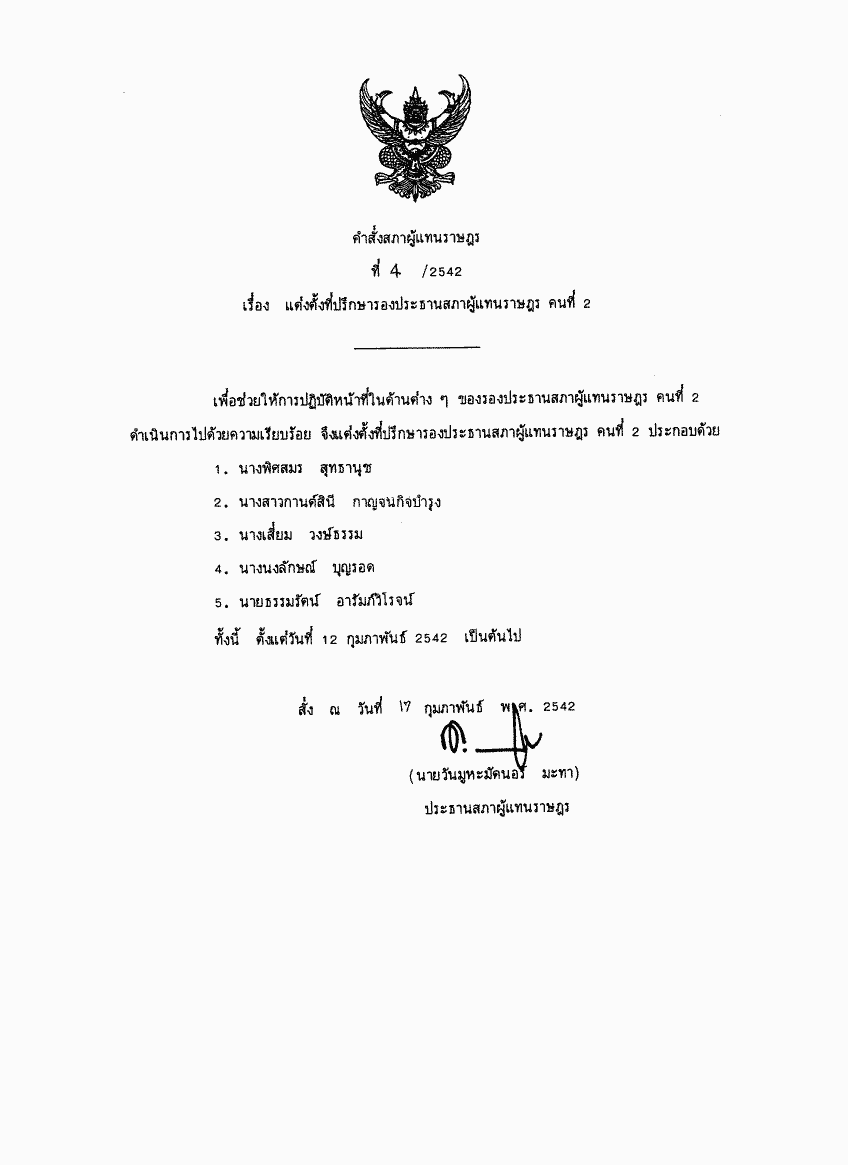 คำสั่งสภาผู้แทนราษฎร ที่ 4/2542 เรื่อง แต่งตั้งที่ปรึกษารองประธานสภาผู้แทนราษฎร คนที่ 2 |
