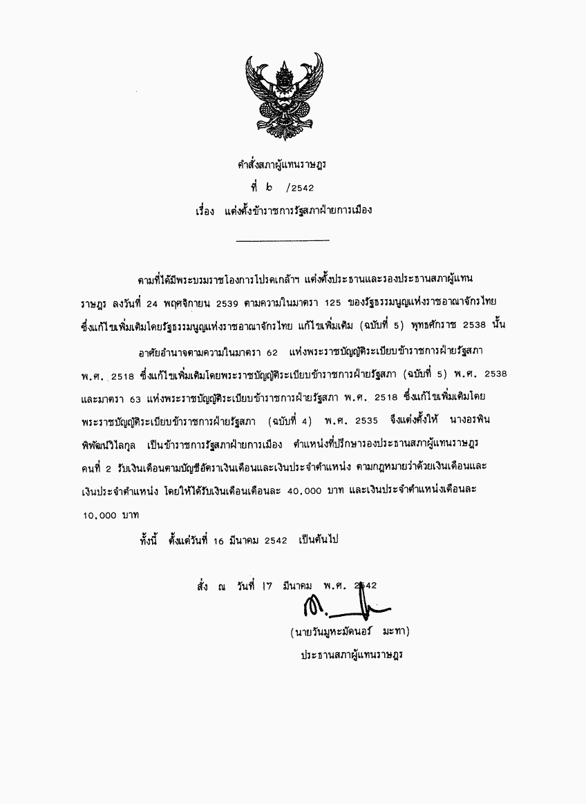 ชื่อเอกสาร : คำสั่งสภาผู้แทนราษฎร ที่ 6/2542 เรื่อง แต่งตั้งข้าราชการรัฐสภาฝ่ายการเมือง