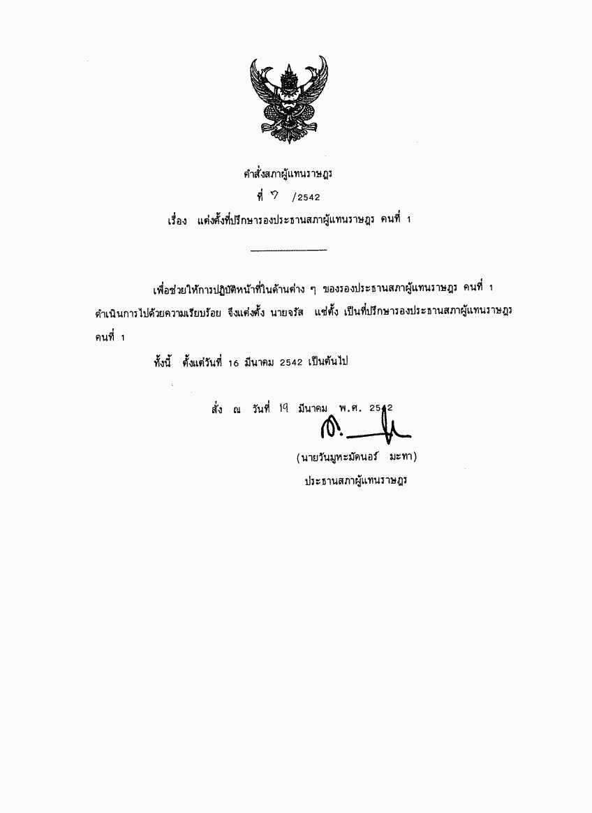 คำสั่งสภาผู้แทนราษฎร ที่ 7/2542 เรื่อง แต่งตั้งที่ปรึกษารองประธานสภาผู้แทนราษฎร คนที่ 1 |