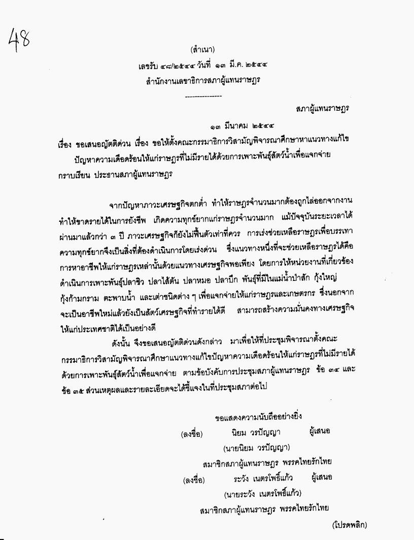 ขอเสนอญัตติด่วน เรื่อง ขอให้ตั้งคณะกรรมาธิการวิสามัญพิจารณาศึกษาหาแนวทางแก้ไขปัญหาความเดือดร้อนให้แก่ราษฎรที่ไม่มีรายได้ด้วยการเพาะพันธุ์สัตว์น้ำเพื่อแจกจ่าย |