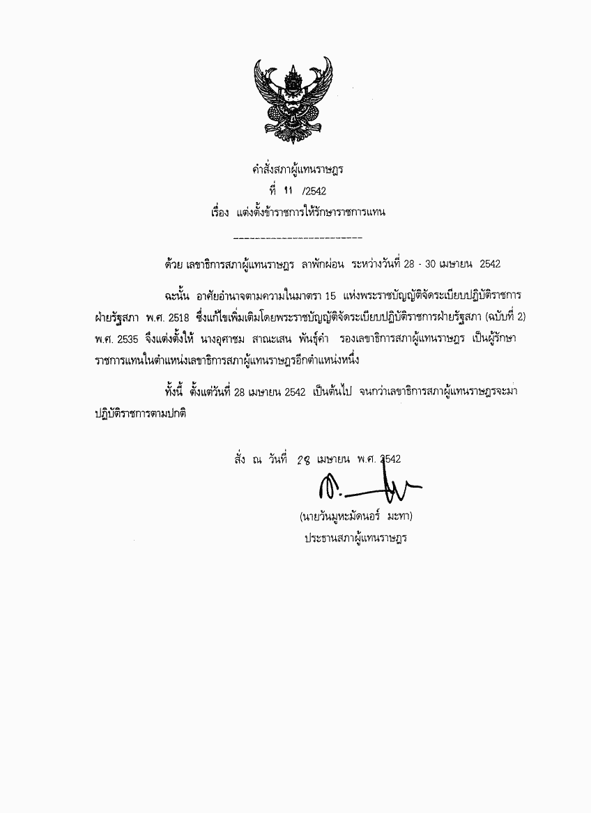 คำสั่งสภาผู้แทนราษฎร ที่ 11/2542 เรื่อง แต่งตั้งข้าราชการให้รักษาราชการแทน |