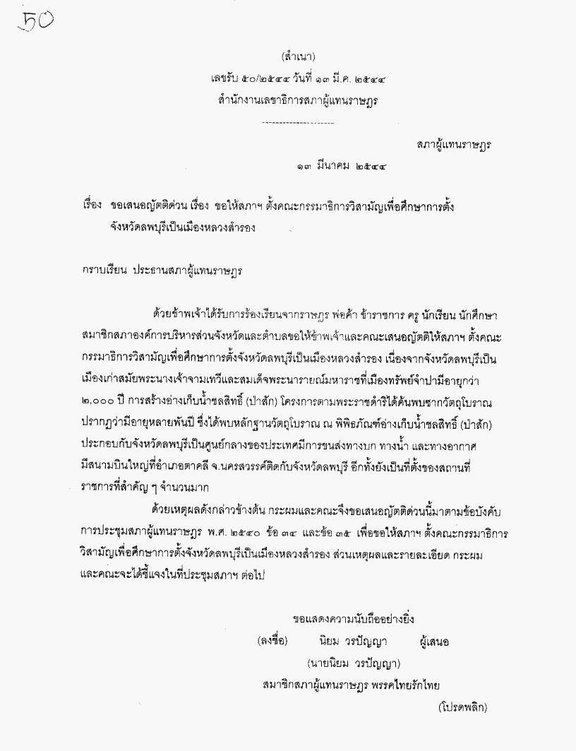 • ขอเสนอญัตติด่วน เรื่อง ขอให้สภาฯ ตั้งคณะกรรมาธิการวิสามัญเพื่อศึกษาการตั้งจังหวัดลพบุรีเป็นเมืองหลวงสำรอง