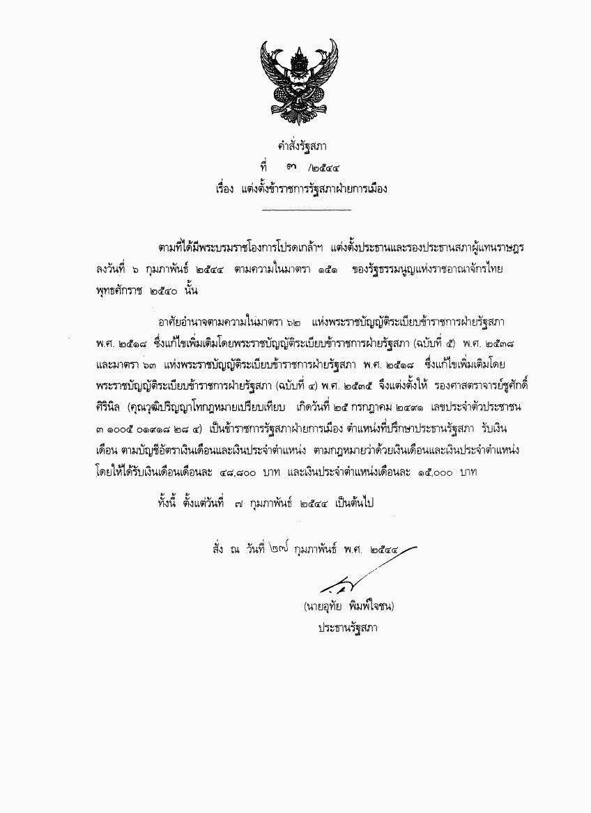 คำสั่งรัฐสภา ที่ 3 / 2544 เรื่อง แต่งตั้งข้าราชการรัฐสภาฝ่ายการเมือง |
