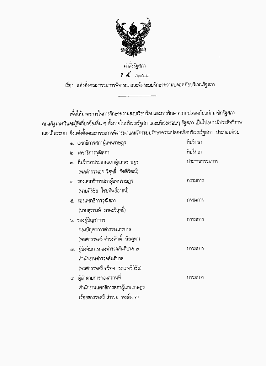 คำสั่งรัฐสภา ที่ 5 / 2544 เรื่อง แต่งตั้งคณะกรรมการพิจารณาและจัดระบบรักษาความปลอดภัยบริเวณรัฐสภา |