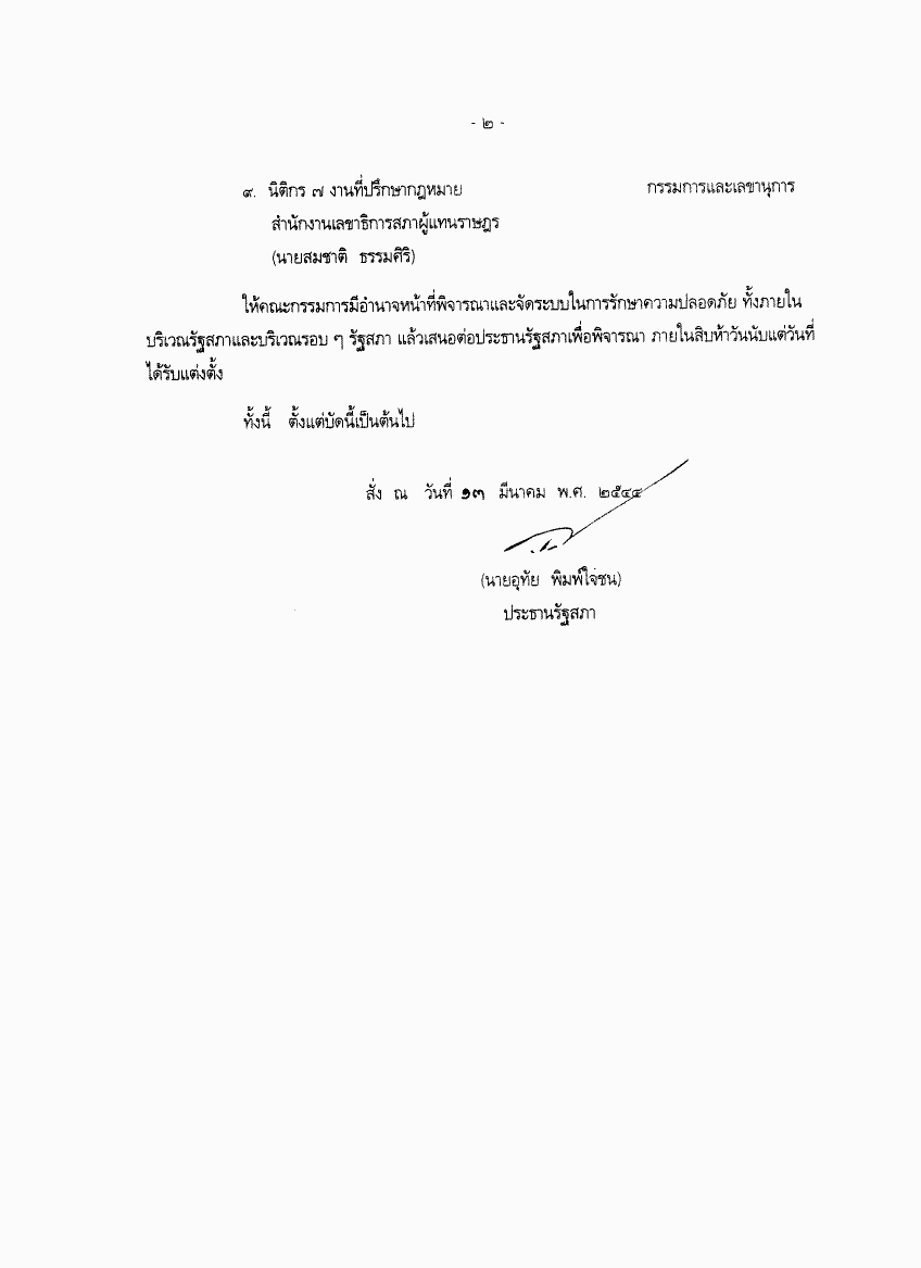 คำสั่งรัฐสภา ที่ 5 / 2544 เรื่อง แต่งตั้งคณะกรรมการพิจารณาและจัดระบบรักษาความปลอดภัยบริเวณรัฐสภา |