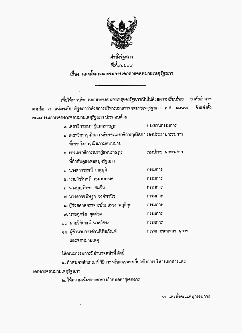 • คำสั่งรัฐสภา ที่ 8 / 2544 เรื่อง แต่งตั้งคณะกรรมการเอกสารจดหมายเหตุรัฐสภา