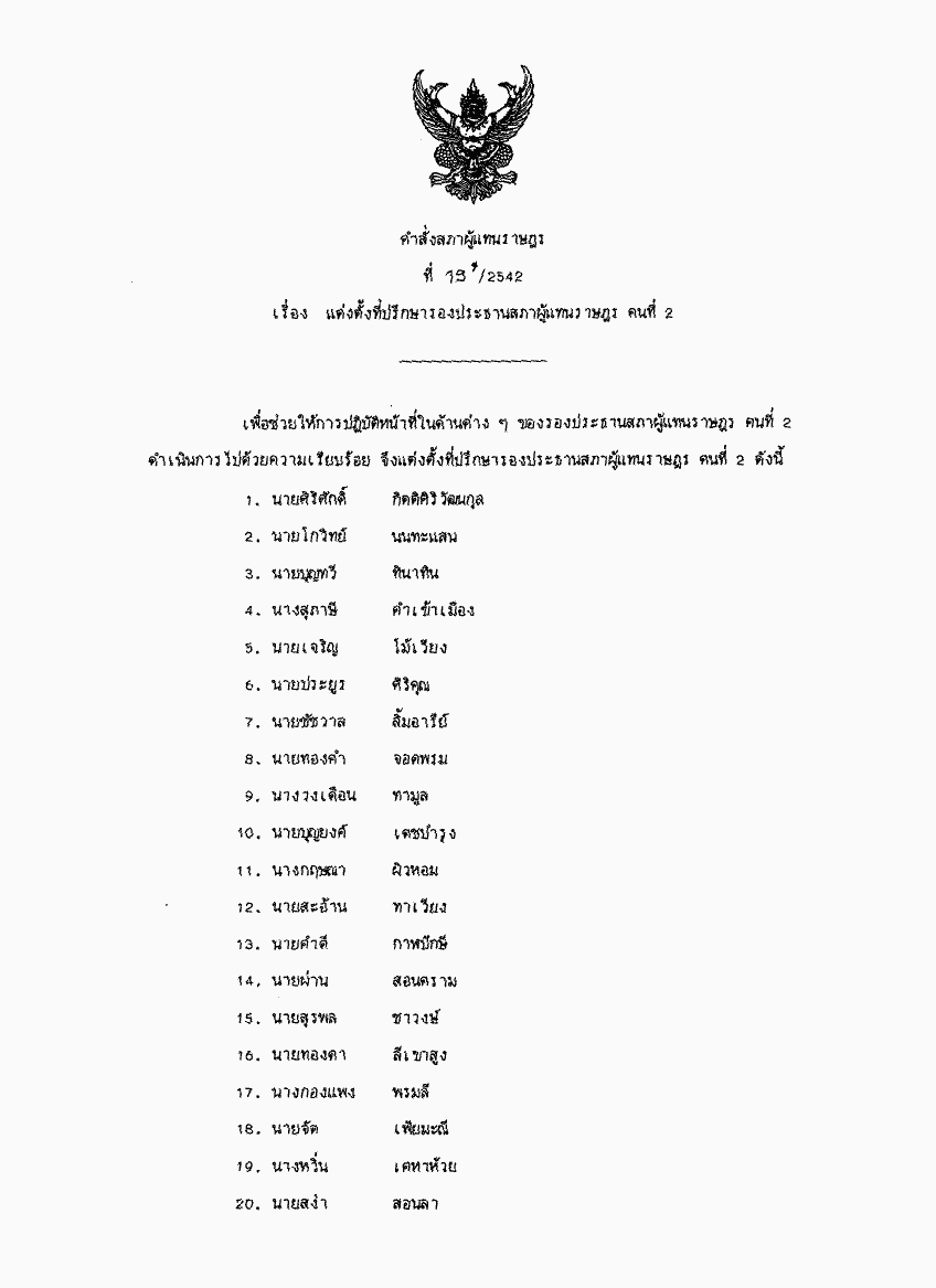 คำสั่งสภาผู้แทนราษฎร ที่ 19/2542 เรื่อง แต่งตั้งที่ปรึกษารองประธานสภาผู้แทนราษฎร คนที่ 2 |