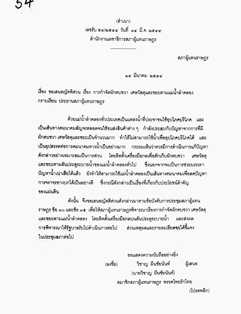 ขอเสนอญัตติด่วน เรื่อง การกำจัดผักตบชวา เศษวัสดุและขยะตามแม่น้ำลำคลอง |