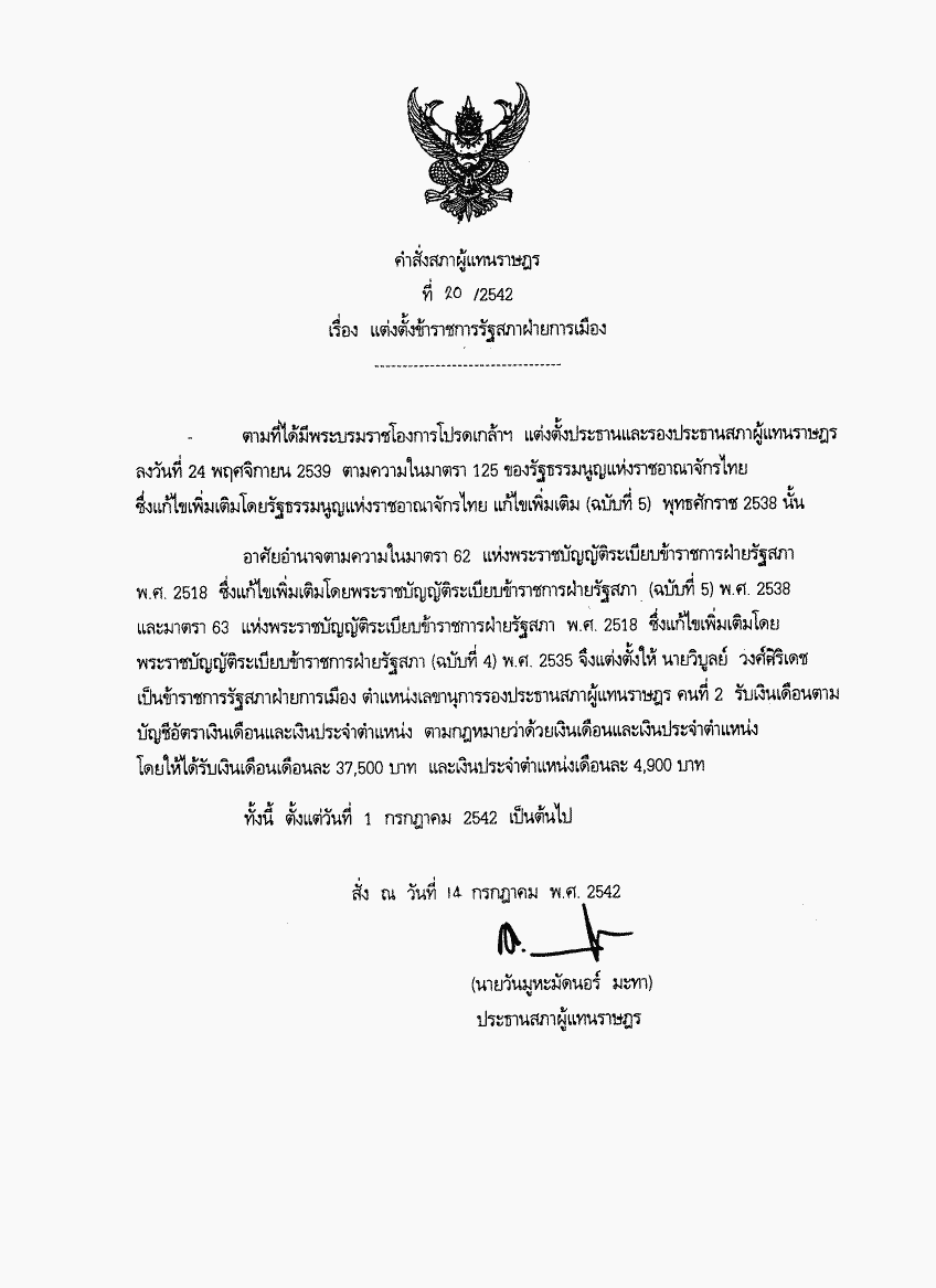 คำสั่งสภาผู้แทนราษฎร ที่ 20/2542 เรื่อง แต่งตั้งข้าราชการรัฐสภาฝ่ายการเมือง |