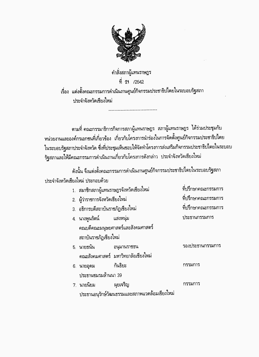 แต่งตั้งคณะกรรมการดำเนินงานศูนย์กิจกรรมประชาธิปไตยในระบอบรัฐสภาประจำจังหวัดเชียงใหม่ |
