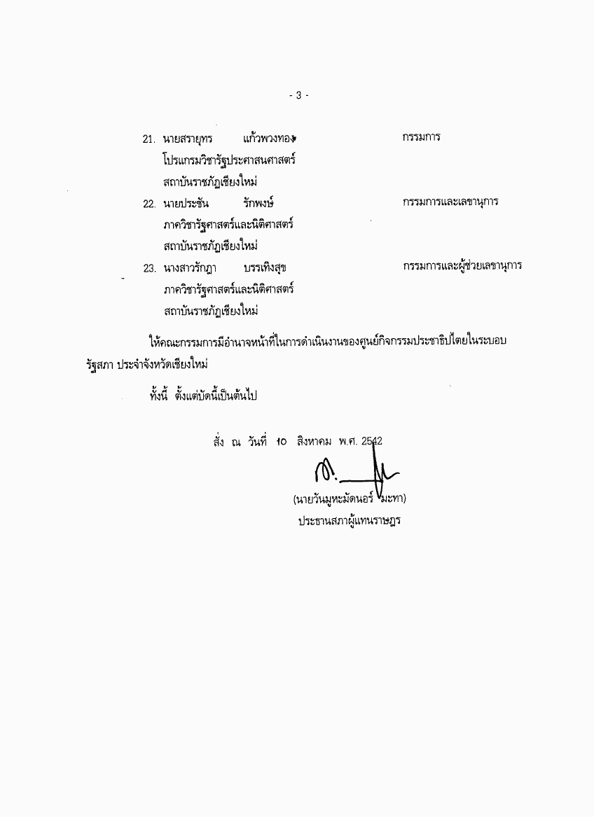 • คำสั่งสภาผู้แทนราษฎร ที่ 21/2542 เรื่อง แต่งตั้งคณะกรรมการดำเนินงานศูนย์กิจกรรมประชาธิปไตยในระบอบรัฐสภาประจำจังหวัดเชียงใหม่