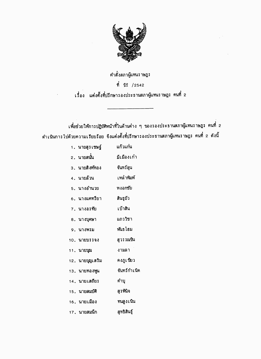 คำสั่งสภาผู้แพราษฎร ที่ 22/2542 เรื่อง แต่งตั้งที่ปรึกษารองประธานสภาผู้แทนราษฎร คนที่ 2 |