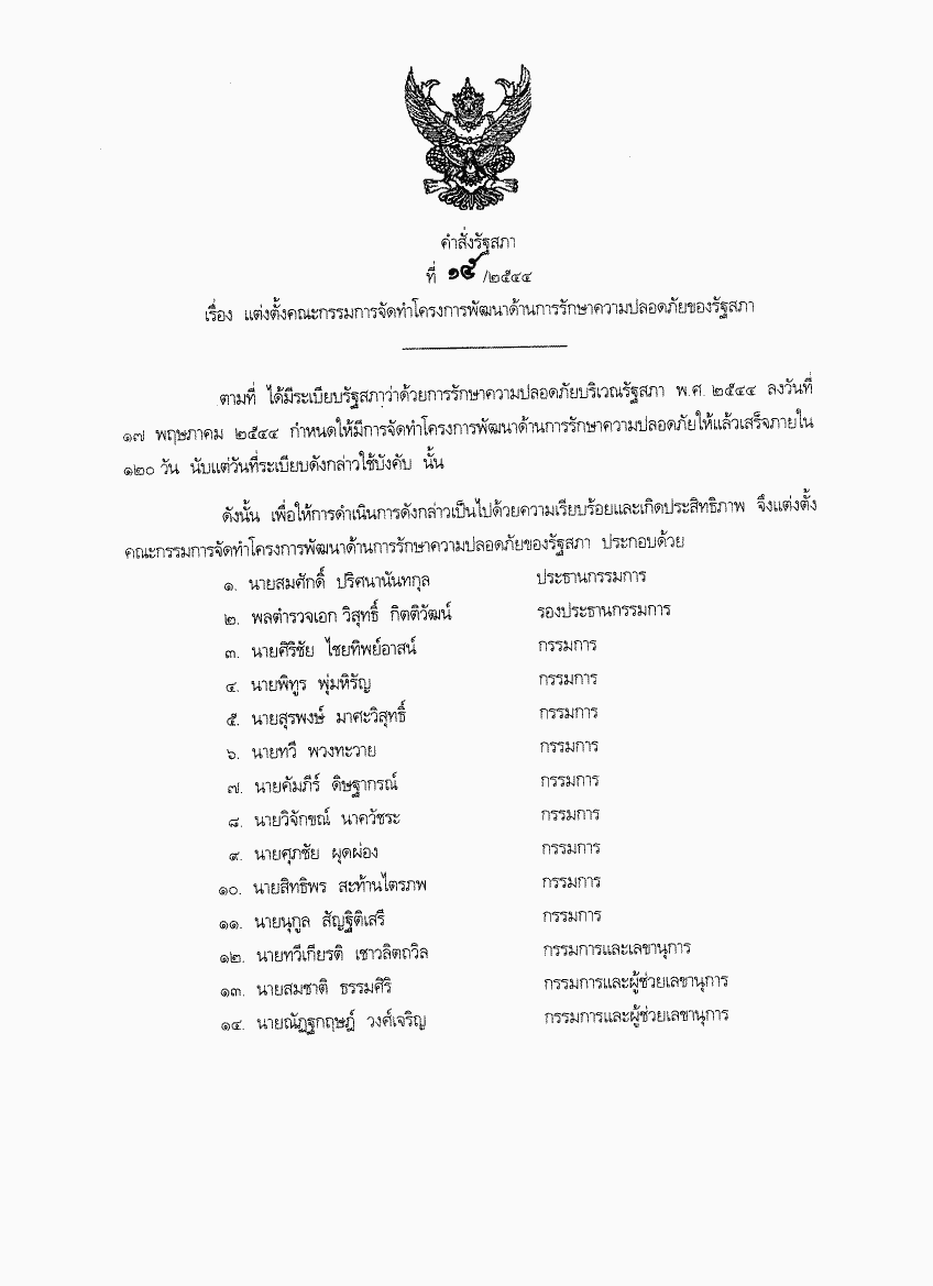 คำสั่งรัฐสภา ที่ 15 / 2544 เรื่อง แต่งตั้งคณะกรรมการจัดทำโครงการพัฒนาด้านการรักษาความปลอดภัยของรัฐสภา |