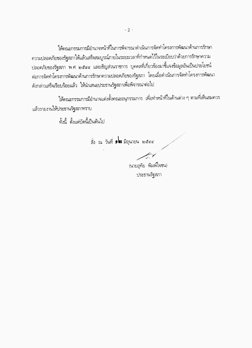 คำสั่งรัฐสภา ที่ 15 / 2544 เรื่อง แต่งตั้งคณะกรรมการจัดทำโครงการพัฒนาด้านการรักษาความปลอดภัยของรัฐสภา |