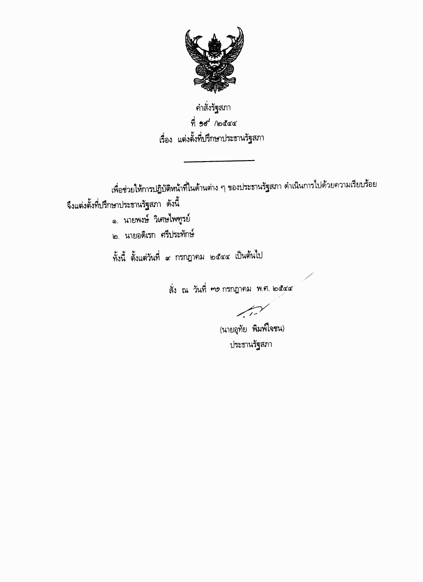 คำสั่งรัฐสภา ที่ 19 / 2544 เรื่อง แต่งตั้งที่ปรึกษาประธานรัฐสภา |