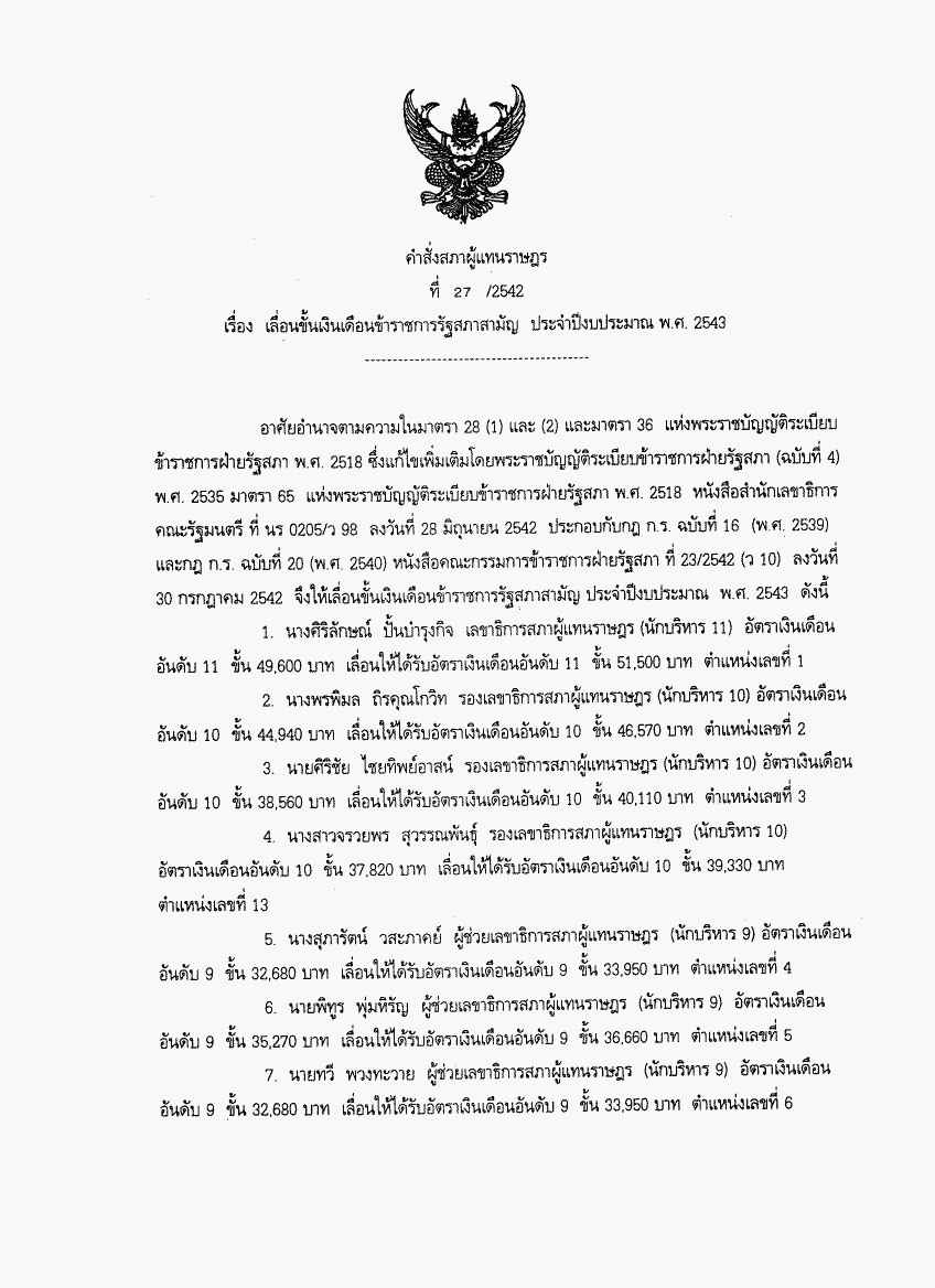 ชื่อเอกสาร : คำสั่งสภาผู้แทนราษฎร ที่ 27/2542 เรื่อง เลื่อนขั้นเงินเดือนข้าราชการรัฐสภาสามัญ ประจำปีงบประมาณ พ.ศ. 2543