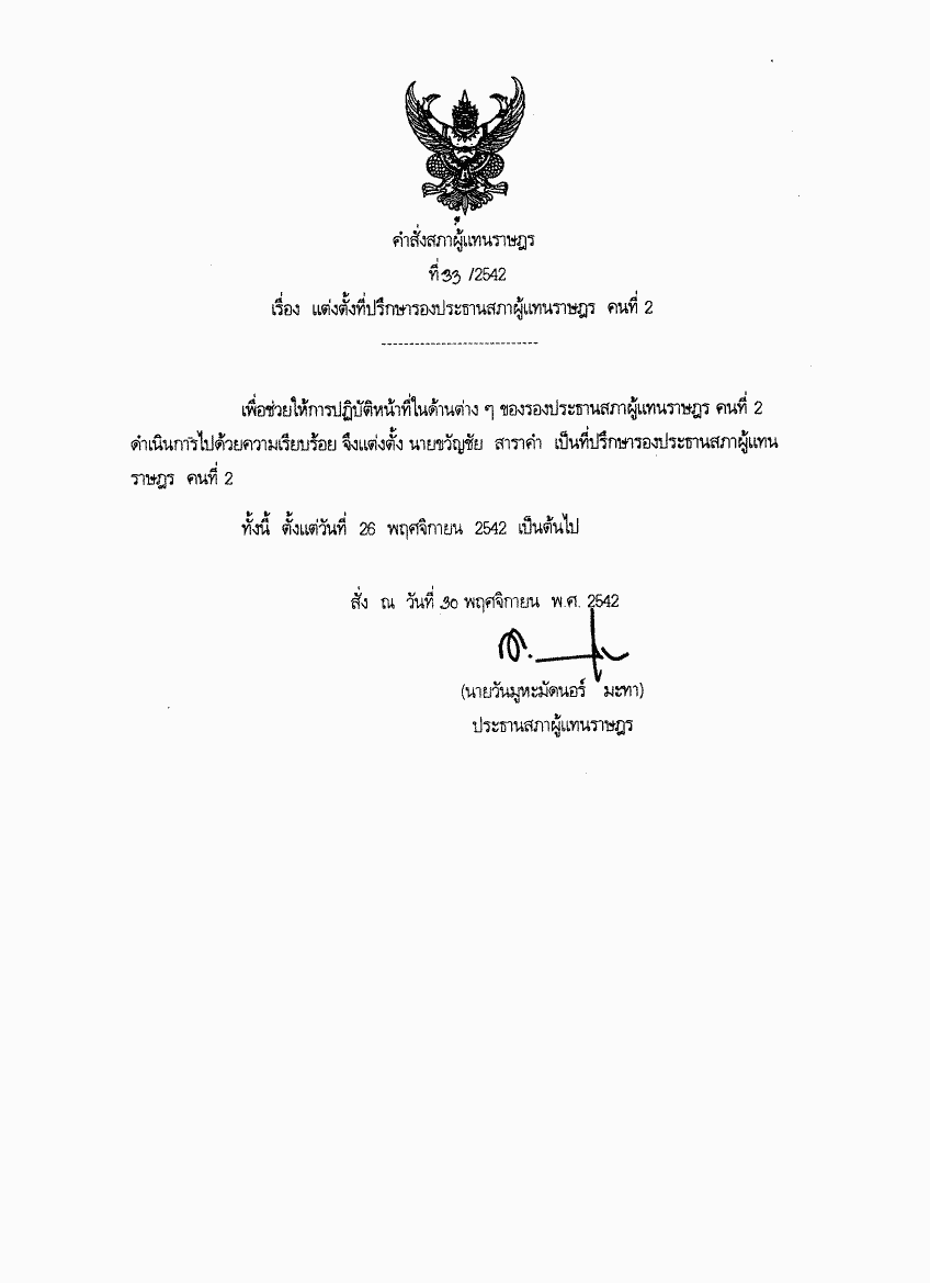 คำสั่งสภาผู้แทนราษฎร ที่ 33/2542 เรื่อง แต่งตั้งที่ปรึกษารองประธานสภาผู้แทนราษฎร คนที่ 2 |