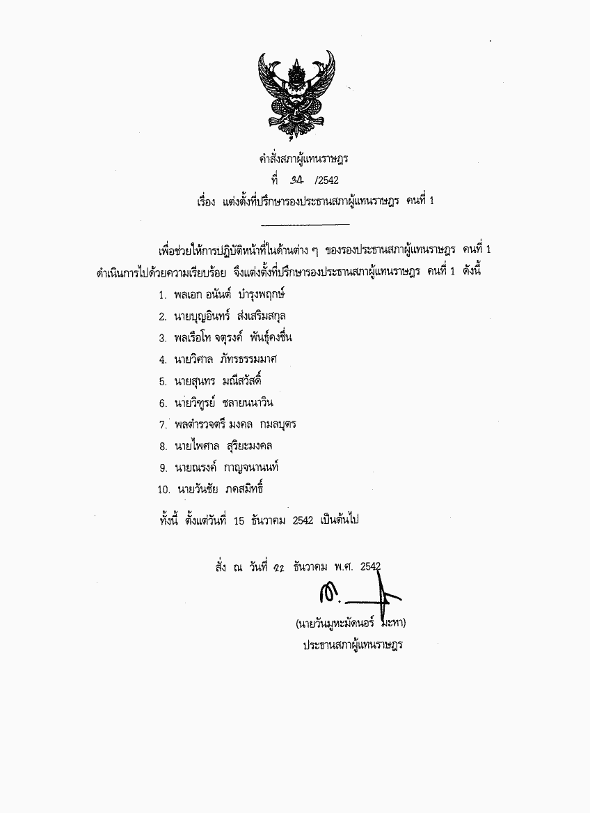คำสั่งสภาผู้แทนราษฎร ที่ 34/2542 เรื่อง แต่งตั้งที่ปรึกษารองประธานสภาผู้แทนราษฎร คนที่ 1 |