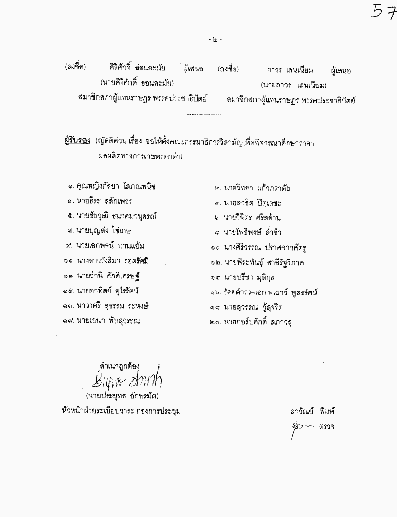 • ขอเสนอญัตติด่วน เรื่อง ขอให้ตั้งคณะกรรมาธิการวิสามัญเพื่อพิจารณาศึกษาราคาผลผลิตทางการเกษตรตกต่ำ
