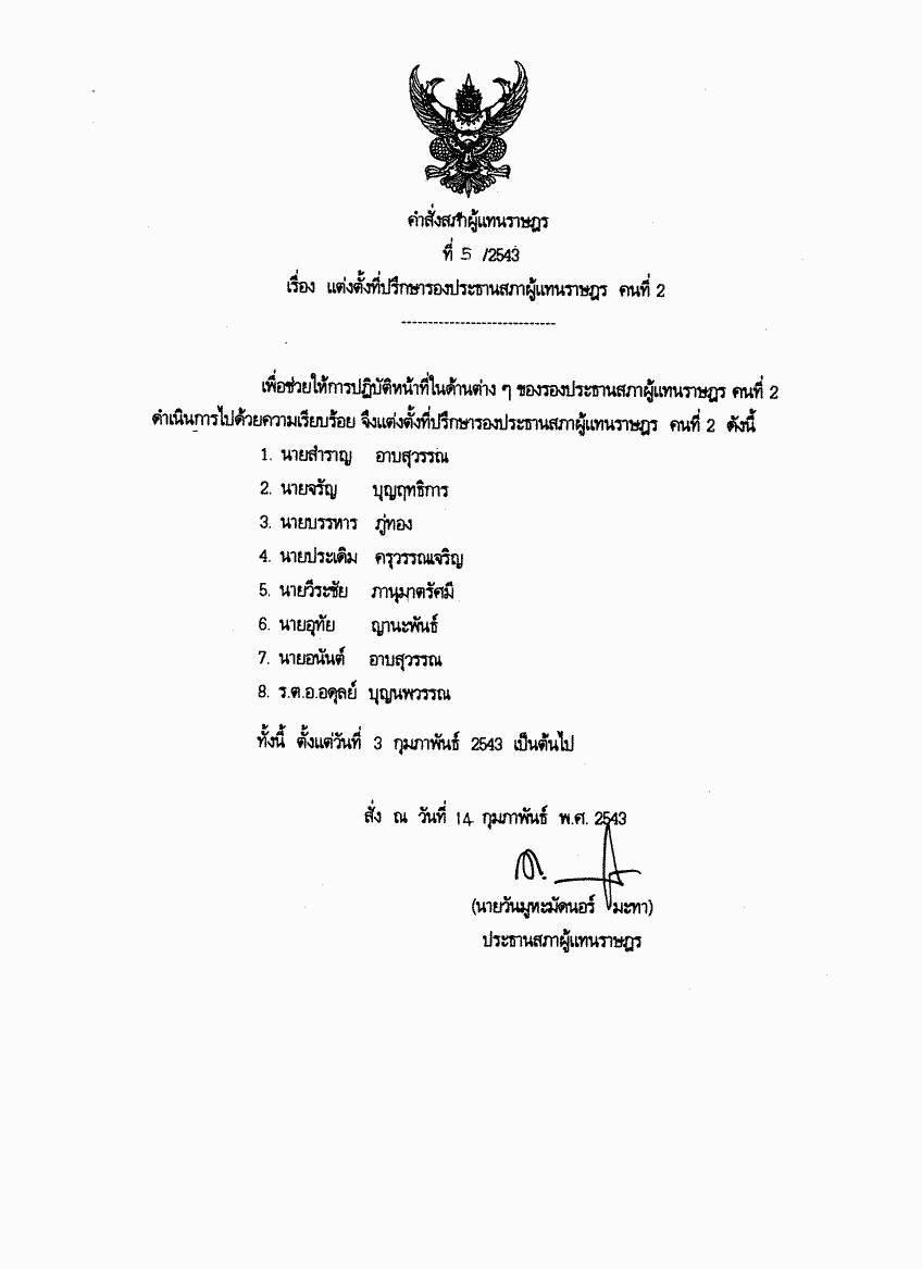 คำสั่งสภาผู้แทนราษฎร ที่ 5/2543 เรื่อง แต่งตั้งที่ปรึกษารองประธานสภาผู้แทนราษฎร คนที่ 2 |